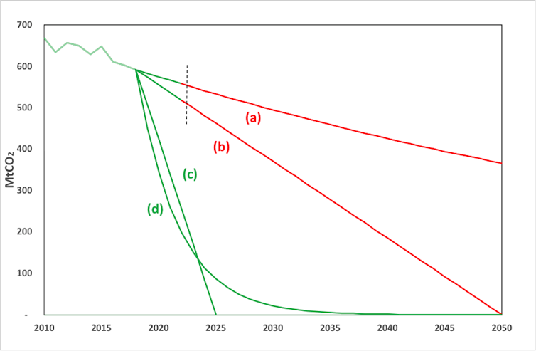 What is notable about this pathway is that, within little more than a decade, carbon emissions must already have fallen to a very low level. With a 24% annual rate of reduction, UK emissions in 2030 would only be 22m tonnes – less than 5% of the current level of emissions. Only a small programme of negative emissions technologies would be needed to achieve net zero at this point.